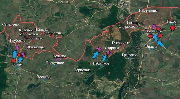 На севере Харьковской области ВСУ продолжают свою контрнаступательную операцию. Однако не сказать, что у противника есть какие-то успехи за последние недели. Ситуация, как и ЛБС, не меняются уже довольно продолжительное время - около месяца. Враг атакует позиции ВС РФ в районе Глубокого, идут бои близ Старицы. В северной части Волчанска подразделения ВС РФ продолжают постепенно теснить врага. Бои разворачиваются севернее, северо-восточнее и восточнее Волчанского агрегатного завода.