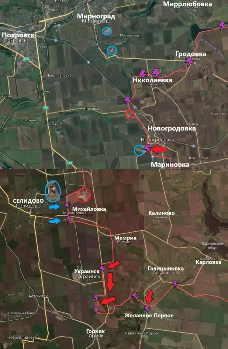 На Покровском направлении российская армия продолжает штурм Селидово с южной и северной стороны, продвигаясь в городской застройке. Также наши парни ведут бои за Украинск. Накануне был полностью зачищен пригород - село Лесовка. Восточнее наши штурмовики продвигаются к Желанному Первому. Выход на следующее село Желанное Второе перережет коммуникацию с Красногоровкой и закроет большой котел с Невельским.