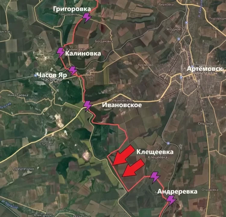 На Константиновском направлении продолжаются бои в районе Григоровки и в микрорайоне Октябрьский в Часов Яре. На этих участках - без изменений. Зато западнее Клещеевки ВС РФ существенно продвинулись - до канала Северский Донец - Донбасс.