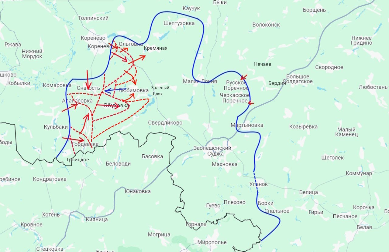 Ну и также, как и вчера противник южнее Глушково, малыми силами тревожил нашу оборону из Сумской области в районе н.п. Новый Путь и медвежье, но это было заметно слабее, чем вчера. А значит либо здесь у противника нет серьезных резервов, либо он их сюда почему-то не перебросил. В целом, наши довольно легко эти попытки отбили.