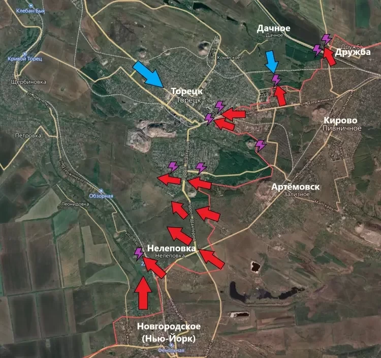 В Торецке (Дзержинске) наши штурмовики укрепились в южной части микрорайона Забалка. Также российская армия пробивается по улице Центральной, разрезая город на несколько частей.