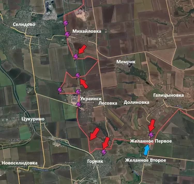 Несмотря на то, что ранее заявлялось о взятии Желанного Первого, сообщается о боях на северных окраина села. Возможно, что это немного устаревшая информация, но о продвижении ВС РФ к Желанному Второму точно не сообщалось.