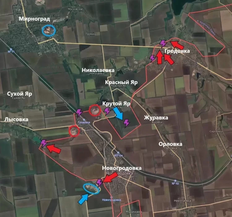 На Покровском направлении подразделения Армии России продвинулись вперед в рамках штурма Гродовки. Под контролем ВСУ остается уже совсем немного территории - около 30% или даже меньше. Ранее предполагалось, что подразделения ВС РФ прорвутся через оборону ВСУ в Николаевке и зайдут гарнизону в Гродовке со спины. Однако, из этого ничего не вышло, и враг смог устоять в Николаевке, а затем и отбить Крутой Яр и Красный Яр. Теперь же ситуация обратная - если нашим бойцам удастся оперативно взять Гродовку, то они смогут зайти группировке ВСУ в районе Яров в тыл, информирует PulsePen.