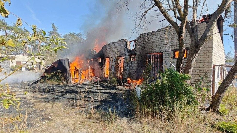 В селе Новая Таволжанка после прилета снаряда огнем уничтожило хозпостройку. Также загорелась сухая растительность и битум. Ликвидацией очагов возгорания занимаются бойцы самообороны, сотрудники МЧС, представители администрации и местные жители.