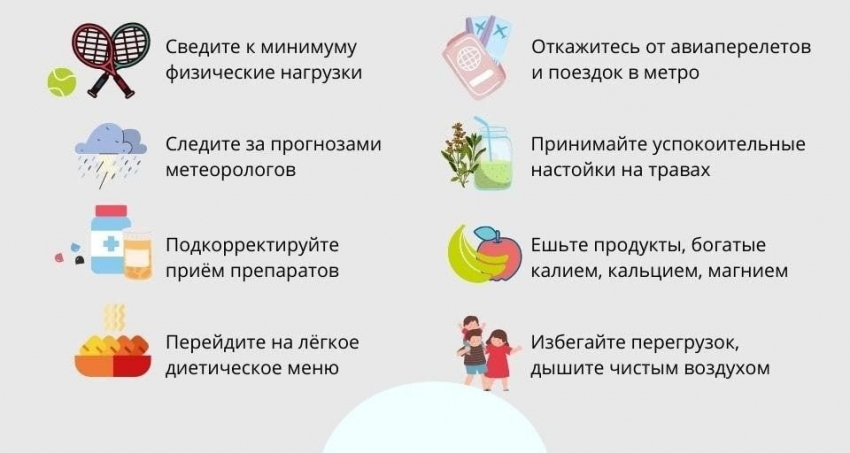 «Магнитные бури крайне неблагоприятно влияют на организм человека … Постараться в дни магнитных бурь избегать тяжелых физических и эмоциональных перегрузок. Желательно соблюдать рацион, который облегчит состояние пациентов: это однозначно избегать крепких напитков, в том числе, алкоголь в эти дни категорически противопоказан. Желательно исключить острую, тяжелую, жирную, жареную пищу», - порекомендовал врач-терапевт Айдар Герфанов.