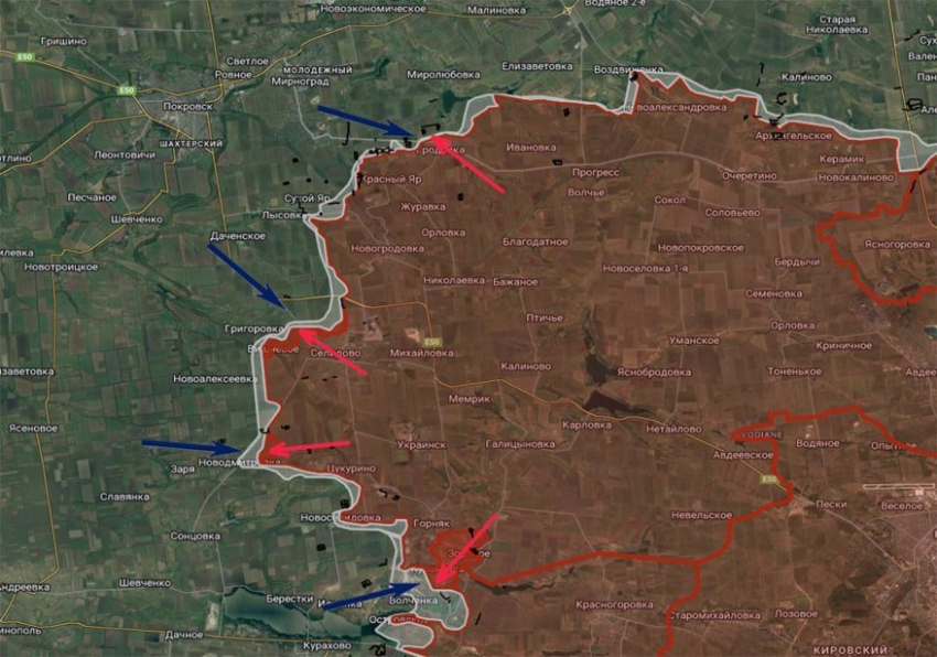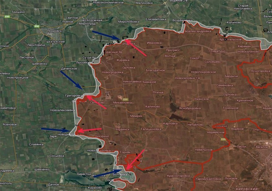 На Покровском направлении российские войска давят на участке Николаевка-Гродовка в направлении Мирнограда. Под контроль российских войск перешли Селидово и Вишневое. В Новодмитровке ВС РФ расширили контроль территории и продвинулись на глубину до 1.3 км. Имеются тактические успехи в районе Измайловки.