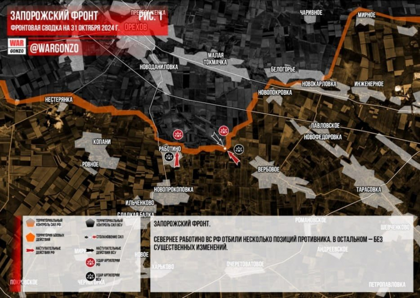На Запорожском направлении севернее Работино ВС РФ отбили несколько позиций противника. В остальном - без существенных изменений.