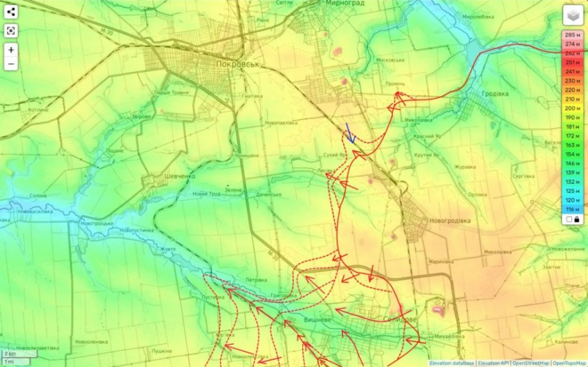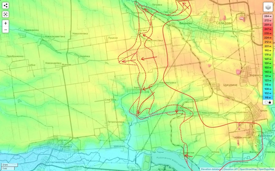 Таким образом все отчетливее и отчетливее имеем движение по направлению к н.п. Шевченко (южному предместью Покровска).