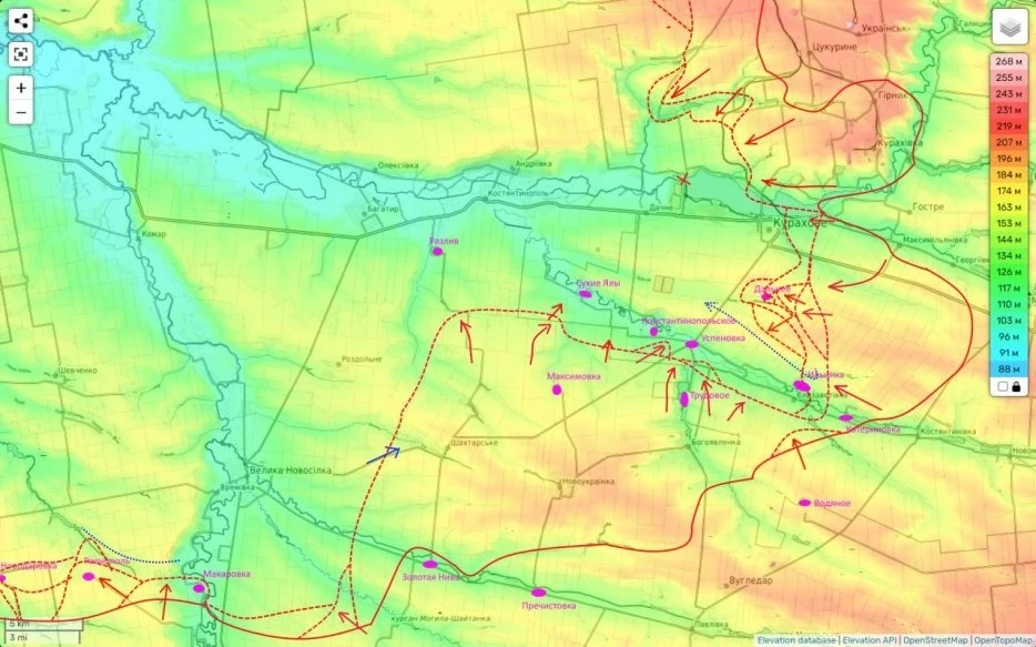 Он уточнил, что российские войска продвигаются в направлении села Константинопольское, расположенного юго-западнее Курахово. Это продвижение сократило расстояние до главной транспортной артерии, соединяющей Запорожье и Курахово, которая используется для снабжения Вооруженных сил Украины.