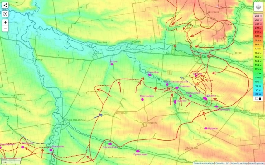 На Южно-Кураховском направлении наблюдается агония ВСУ на реке Сухие Ялы. За вчера наши части со стороны Трудового вышли к реке и по данным источников противника, от Успеновки нас отделяет только этот ручеек. Также наши части широким фронтом вышли к Елизаветовке и находящемуся чуть ниже по течению хутору Весёлый Гай.
