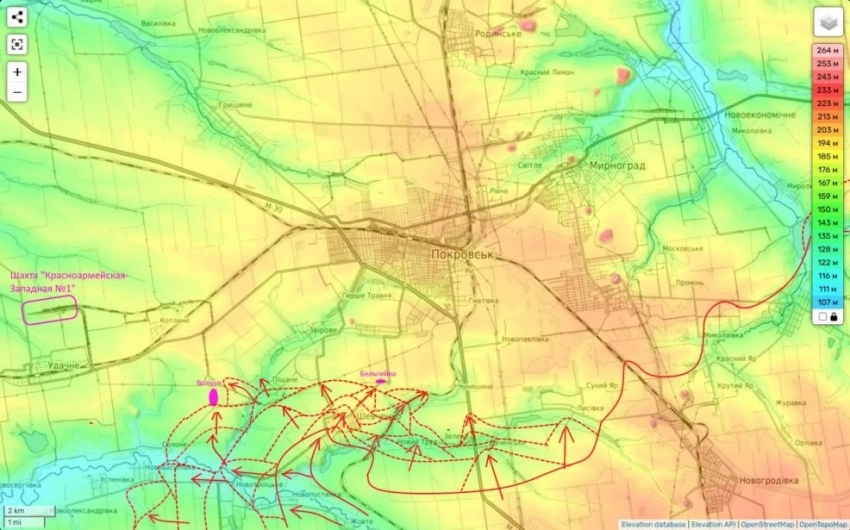 Между тем группировка российских войск «Центр» выбивают ВСУ из Песчаного к югу от Покровска, одновременно стремясь обойти его с запада. Также российские бойцы завершают штурм села Даченское. В его восточной части ВС РФ продвинулись на глубину до 750 метров, информирует "Репортёр".