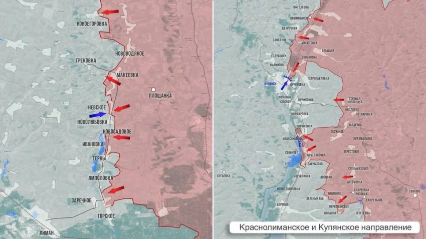 На Купянском фронте МО РФ объявило об освобождении Калиново, что на правом берегу реки Оскол в 10 км к северу от Купянска. То есть наши значительно расширили плацдарм на юге от Двуречной. С высот в районе Калиново можно пойти как на юг - непосредственно на Купянск, так и на север - в сторону Двуречной.