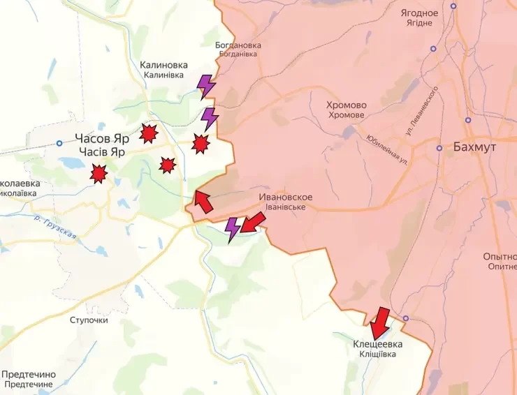 На Часовоярском направлении продолжаются бои в восточном пригороде Часов Яра, где российские войска смогли улучшить свои позиции. Продолжаются бои западнее Ивановского (Красного). Есть тактические успехи и на северном фланге, где российские войска смогли продвинуться в районе Богдановки. В районе Клещеевки продолжаются ожесточённые бои, пишет Telegram-канал Wargonzo.