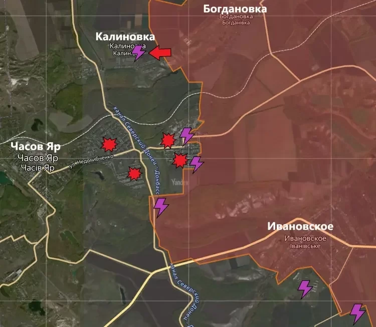 В Часов Яре идут ожесточённые бои. Военный корреспондент Марат Хайруллин сообщает, что наши подразделения продвинулись в полях к северу от Калиновки и практически взяли в полуохват подразделения противника, которые находятся в посадках севернее Богдановки.
