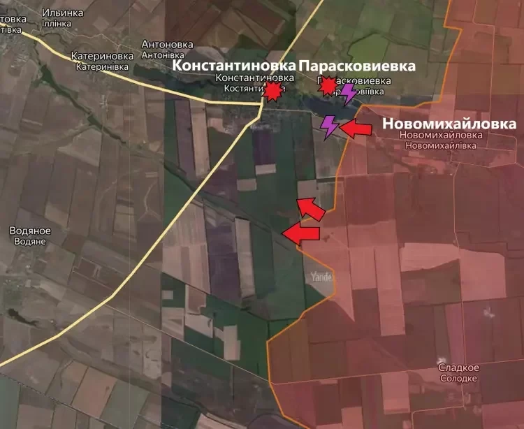 На Угледарском направлении продолжаются локальные боестолкновения в Парасковиевке. Около половины населённого пункта всё ещё контролирует противник. Южнее, на дороге из Новомихайловки в Константиновку, идут бои. Есть незначительное продвижение ВС РФ вперёд. Также продвижение зафиксировано ещё южнее. Наши бойцы взяли несколько лесопосадок и продвинулись на запад и северо-запад.