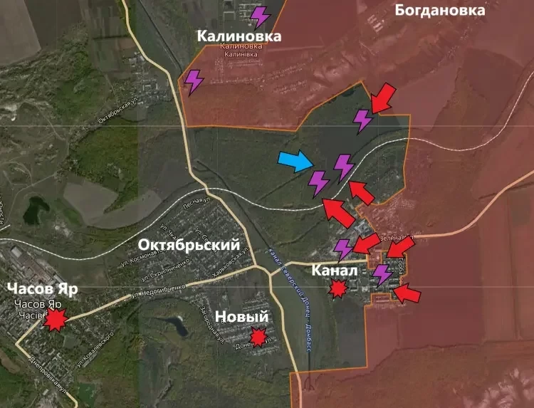 На Константиновском направлении в Калиновке идут бои на западных и северных окраинах. Помимо этого, наши бойцы атакуют лесной массив в треугольнике Калиновка - Богдановка - микрорайон Канал. Атаки идут практически со всех сторон. Подразделения ВС РФ поддавливают боевиков киевского режима, однако полностью выдавить врага из лесного массива пока что не удаётся.