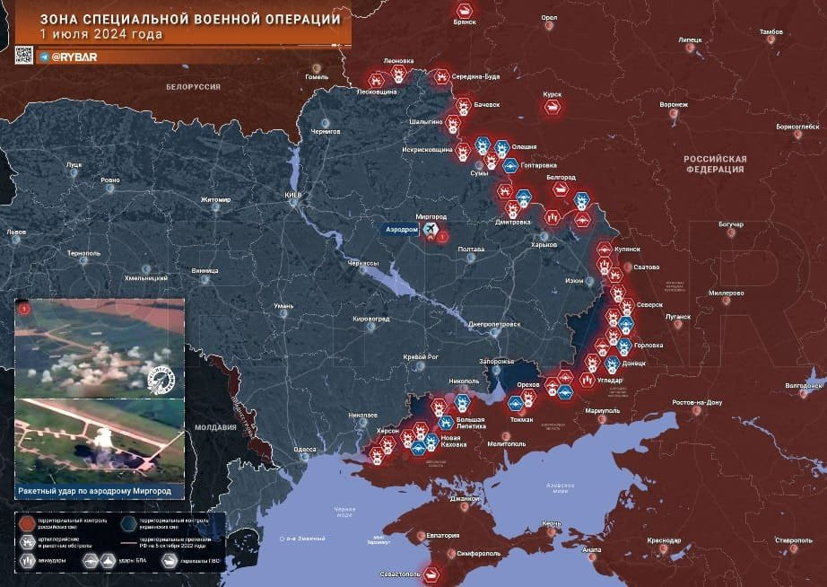 1 июля Минобороны РФ сообщило о том, что авиация, артиллерия и беспилотники России поразили самолеты ВСУ на открытой стоянке, а также инфраструктуру военного аэродрома. При этом некоторые издания публиковали видео, на котором, как утверждается, были запечатлены удары по аэродрому в Миргороде.