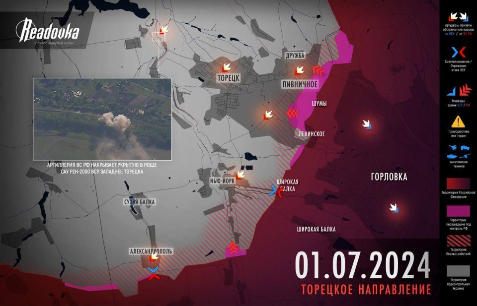 На Александро-Калиновском направлении идет штурм Дзержинской (Торецкой) агломерации, российские войска с боем продвигаются в районе поселка Шумы и к югу от Новгородоского (Нью-Йорка). Соответствующие данные приводит "Рыбарь".