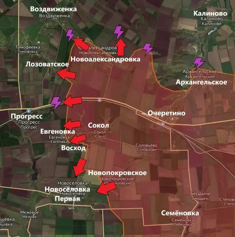 Подразделения ВС РФ продолжают продвижение к северо-западу от Очеретино. Есть небольшие успехи в направлении Воздвиженки. Также наши бойцы вплотную подобрались к восточным окраинам Лозоватского. Взятие этого населённого пункта под контроль ВС РФ облегчит продвижение как в сторону Воздвиженки (севернее), так и в сторону Прогресса вдоль железной дороги (южнее).