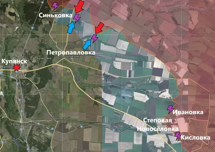 В восточной части бои идут и Ивановки и Кисловки. Еще вчера враг сообщал о продвижении ВС РФ в районе Степовой Новосёловки. На текущий момент информации о взятии этого населённого пункта под контроль Армии России нет.