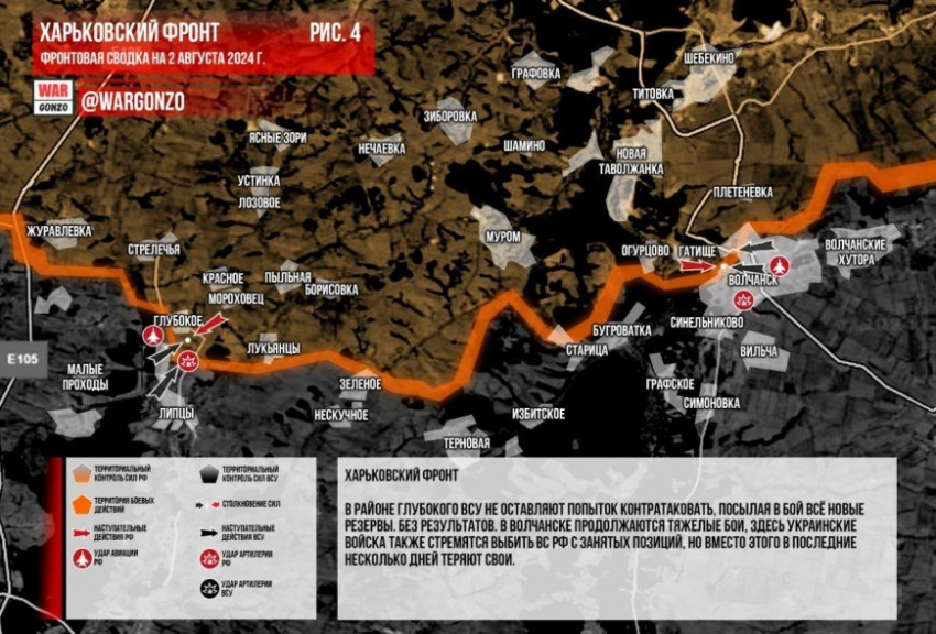 Обновлённая карта боевых действий на Украине по данным на 12:00 мск сегодня, 02.08.2024
