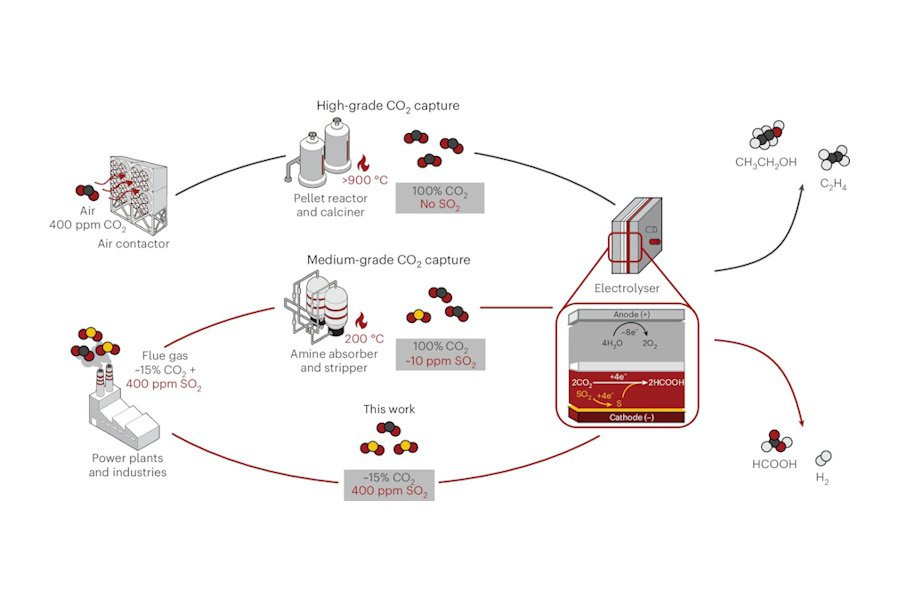 Исследователи с Инженерного университета Торонто достигли значительного прорыва в области электрокаталитической конверсии углекислого газа (CO2) с использованием нового катализатора. Разработка способна эффективно преобразовывать углекислый газ в ценные продукты даже в условиях высоких концентраций загрязняющих веществ, таких как диоксид серы (SO2), сообщает Nature.