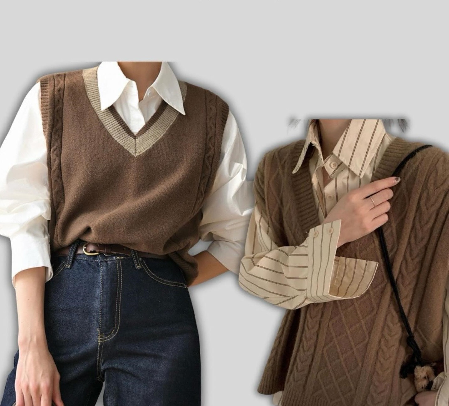 Игривость и стиль могут сочетаться в образе, использующем коричневые трикотажные жилеты оверсайз. Этот тренд, иногда называемый «в стиле деда», добавляет образу нотку непринужденной элегантности. Вы можете сочетать такие жилеты как с деловыми костюмами, так и с джинсами или юбками для кэжуал-образа.