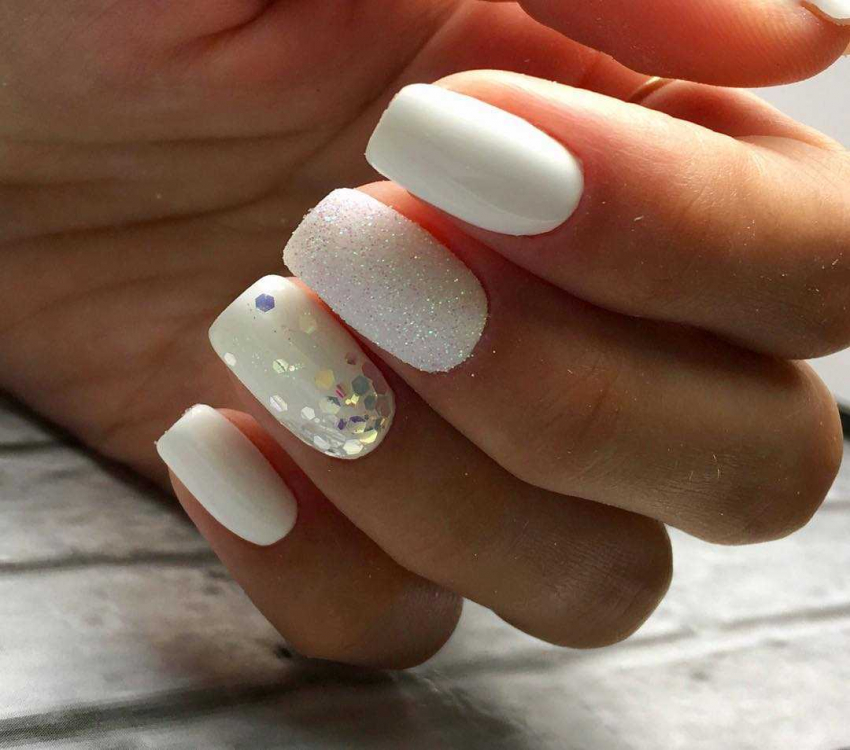 Белый лак может быть не менее выразительным, чем более яркие цвета. Искрящийся белый напоминает о первом снеге, добавляя контраста и стиля даже к загорелым ногтям. Этот оттенок особенно хорошо смотрится в летнее время, создавая эффект свежести и чистоты.